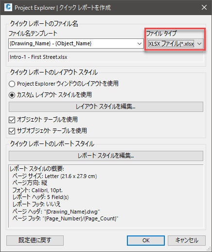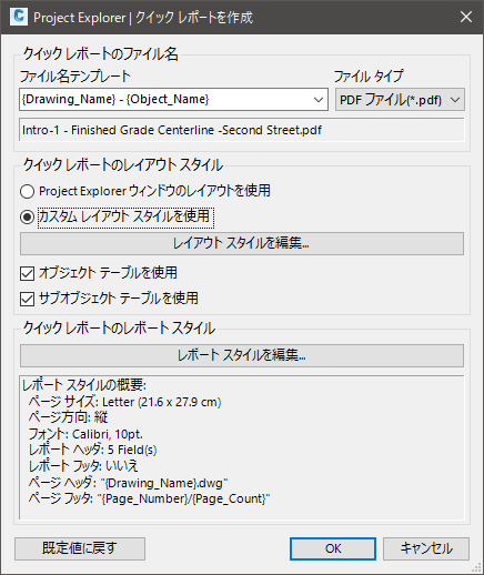 このチュートリアルでは、Project Explorer を使用して簡単な Civil 3D 線形/縦断レポートを PDF ファイルに生成する方法を学習します。次に、Excel XLSX ファイルに同じレポートを書き込みます。