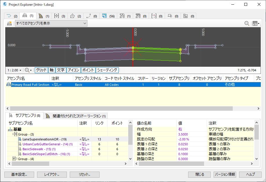 - このアセンブリのサブアセンブリ リストで、LaneSuperelevationAOR - (19)を選択します。
