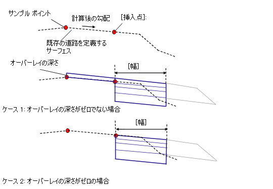 既存サーフェス上のサンプル ポイントと挿入ポイントの標高が決定され、サンプル ポイントから挿入ポイントへの勾配が計算されます。計算された勾配と指定したオーバーレイの深さで、既存の車線上にオーバーレイ層が追加されます。既存の勾配上に 1 つまたは複数のリンクを重ねることで、閉じられたオーバーレイ シェイプが作成されます。拡幅車線は、計算された勾配で、挿入オフセットのオーバーレイから外側に向かってアタッチされます。