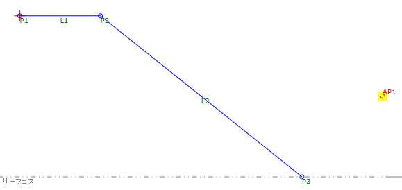 AP1 補助マーク ポイントです。[Delta X]と[Delta Y]の値はともに P3 から 0.5、つまり P2 からターゲット サーフェスへの勾配です。サーフェスの標高が変化すると、P4 は P3 を基準とした位置を維持します。