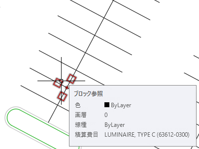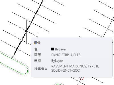 この操作によってオブジェクト選択モードが起動します。オブジェクト内のポイントではなく、閉じたオブジェクトのアウトラインを選択できます。いくつかの駐車場の交通島はパイプで分割されているため、オブジェクト選択モードを使用して、選択した閉じた領域のみでなくオブジェクト全体に積算費目コードを割り当てることができます。