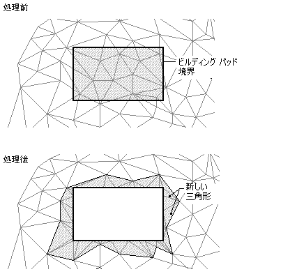 また、池にあるサーフェスの TIN 線分またはグリッド線を削除することもできます。これは、空の領域を作成する場合などに行います。この線を削除することで、等高線が空の領域に描画されないようにできます。