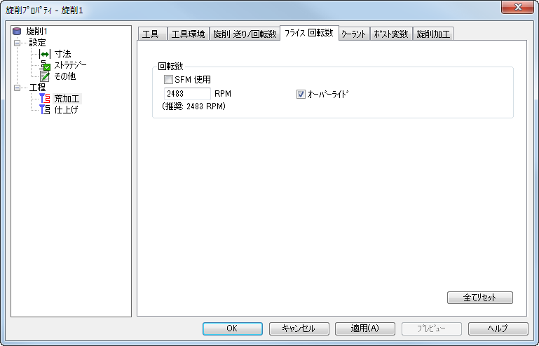 フライス 回転数 タブを使用して、旋削加工工程でのフライス加工工具の回転数を制御します。このタブは、ストラテジー タブで ターンミリング タイプの ツールパス を選択した場合のみ利用することができます。