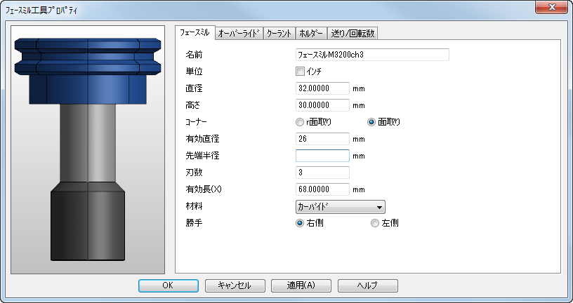 この新規工具でフェース フィーチャーの工具をオーバーライドします。また、デフォルトの工具をオーバーライドして面取りフィーチャーの加工にも使用します。