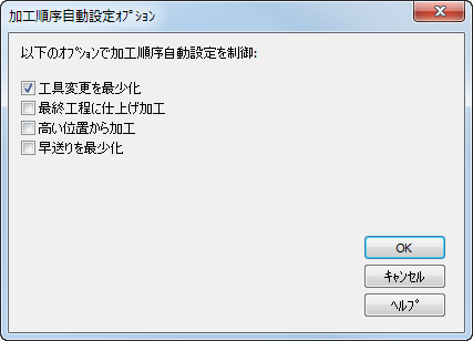 工具変更を最少化 - 同じ工具を使用する工程を、グループにまとめます。無駄な工具変更を削除したり、工具変更の回数を抑えたりすることで、加工時間を短縮します。NC データに孔あけのサブプログラムを生成する場合、このオプションを選択しておかなければなりません。