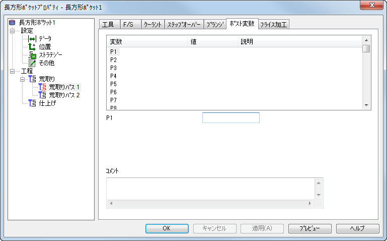 このページには、変数のリストが表示されています。変数の を入力して、ポスト内でその変数が使用された際に、その変数に割り当てた値を NC データに出力します。