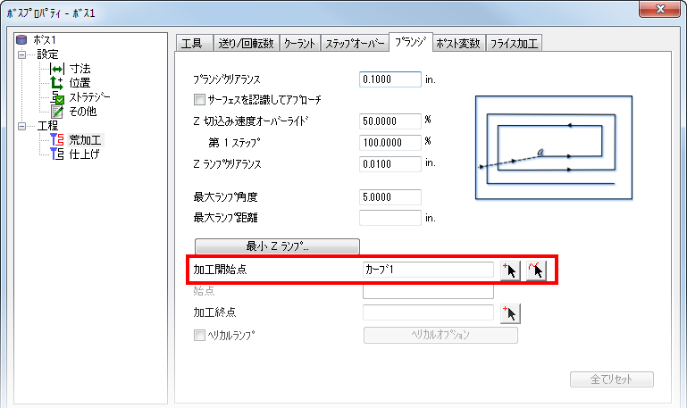 3. フィーチャー プロパティ ダイアログの プランジ タブで、作成したカーブを 加工開始点 、または、始点 に指定します。