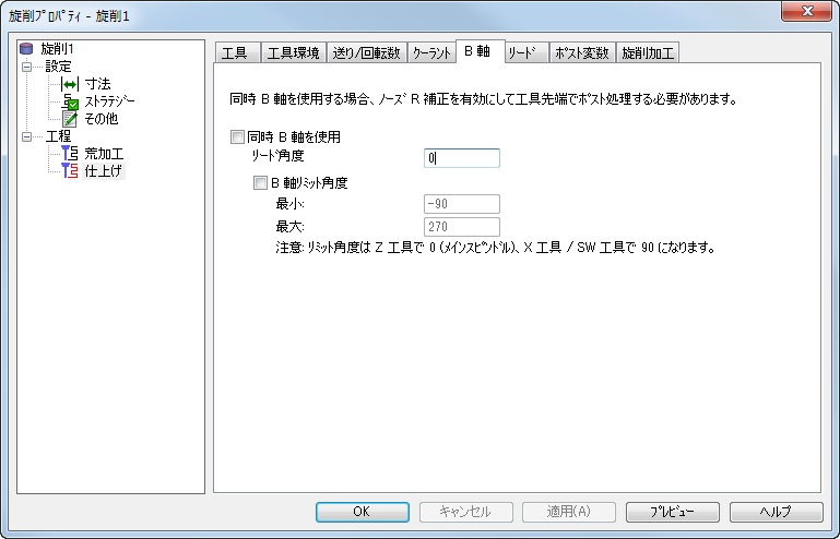 B 軸リミット角度 - 任意で、B 軸の角度を制限することができます。B 軸リミット角度には、最小 -90 度 から 最大 270 度までの値を入力します。