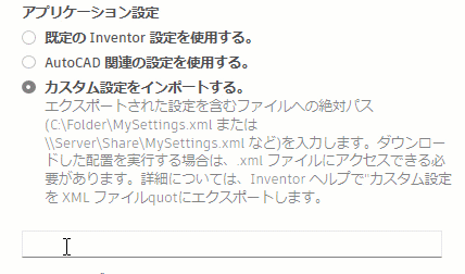 [アプリケーション オプション]ダイアログで作成した xml ファイルからカスタマイズされた[アプリケーション オプション]設定がインストールされます。 このオプションを使用すると、設定を名前付きファイルに保存して適用することで、[アプリケーション オプション]設定を管理することができます。