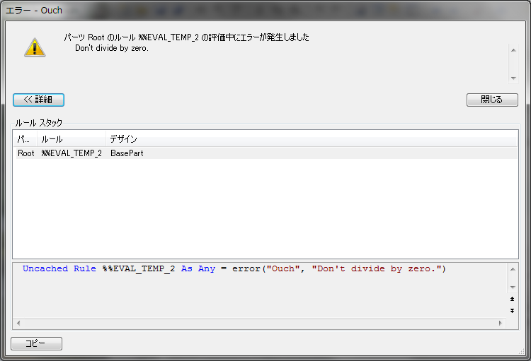 指定された文字列をエラー メッセージとして使用してエラーを発生させます。すべての組み込み言語エラーと同様に、このエラーは常に現在の計算にとって致命的です。エラーの実際の影響は、ルールを実行している環境によって異なります。Inventor では、例に示すような "標準の" エラー ハンドラ ウィンドウが表示されます。カスタム ユーザ インタフェースでは、エラーを表示する UI 次第で決まり、アプリケーション固有の方法で表示されます。