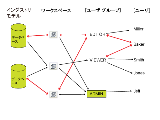 インストール後は、1 人の既定ユーザとして、ADMIN ユーザ グループのメンバーである管理者が存在します。エンタープライズ インダストリ モデルのみの場合、VIEWER や EDITOR など、異なるアクセス権を持つユーザ グループをさらに作成できます。Mr. Smith や Ms. Miller など、エンタープライズ インダストリ モデルを使用する担当者ごとにユーザを作成します。