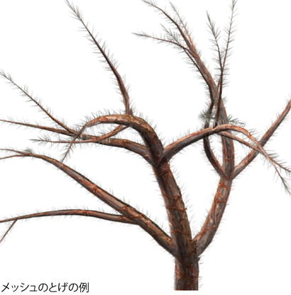 メッシュ(Mesh)ブラシ タイプ(Brush Type)を使用しているときに、作成した三角形のサーフェスに無数のとげを植え付けることができます。細線(ThinLine)ブラシ タイプ(Brush Type)に関連するレンダリング手法を用いて描画し、すばやくレンダーします。とげは単一セグメントのチューブであり、ストロークのワイヤフレーム表示には現れません。とげを用いて、植物に刺や毛を植え付けたり、毛皮で覆われたチューブや不規則なシェイプのチューブを作成したりすることができます。