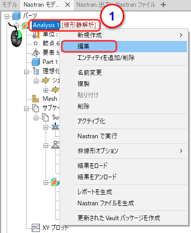 1. 解析ツリーの[解析 1]を右クリックして、[編集]をクリックします。