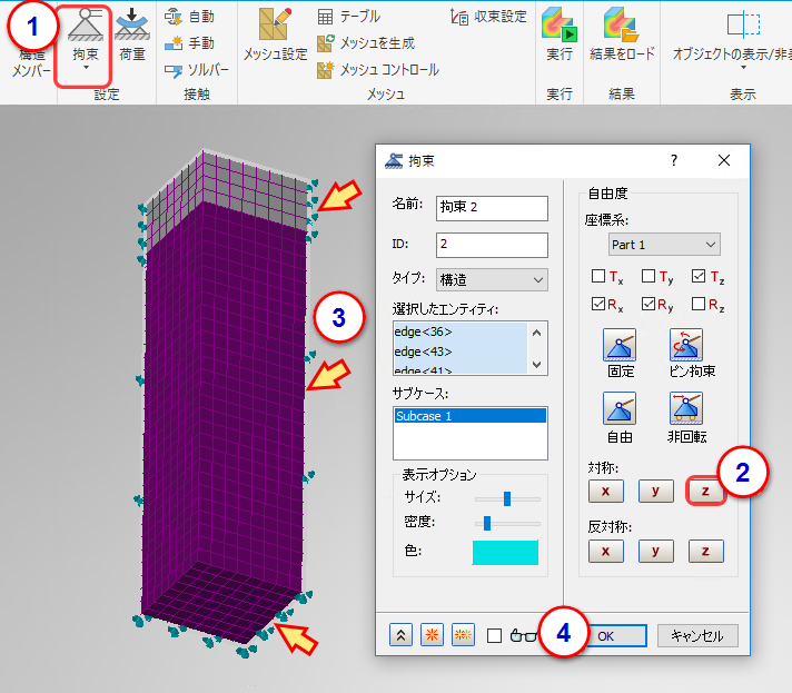 この手順では、XY 平面で Z 対称を対称エッジに割り当てます。