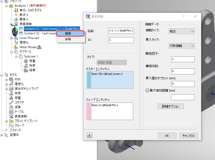 既定では、自動的に計算されたすべての接触ペアは[結合]に設定されます。つまり、モデルに力がかかると、2 つのパーツは接触面で一緒に移動します。接触の定義を変更するには、ツリーの接触エントリを右クリックして、[編集]をクリックします。次のようにリストから目的の接触タイプを選択できます。