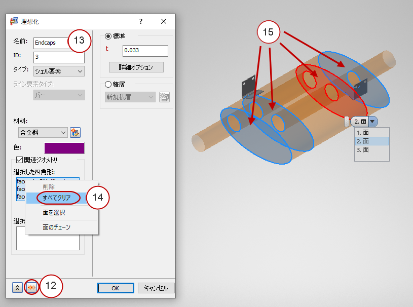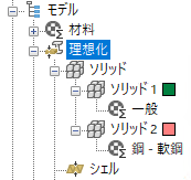 モデル ツリーで、[理想化]を展開します。理想化が定義済み(下図の Solids 1 や Solid 2 など)の場合は、右クリックしての順に選択し、不用な材料が解析に混入しないようにします。