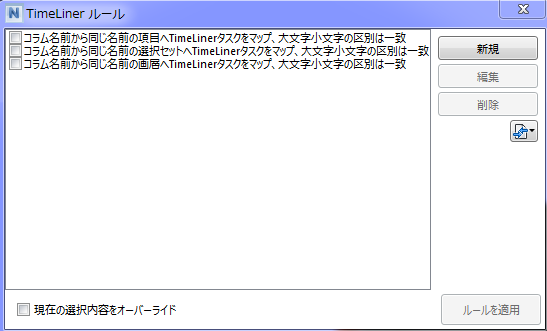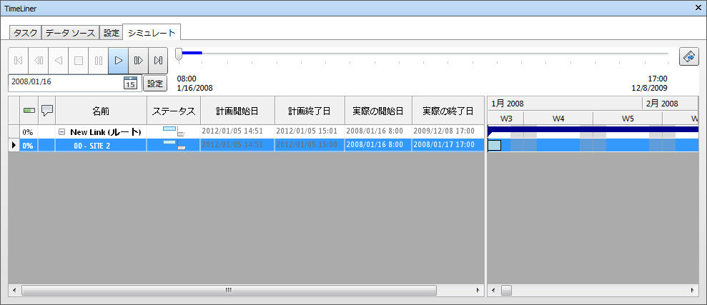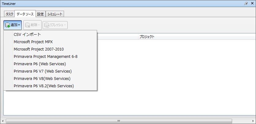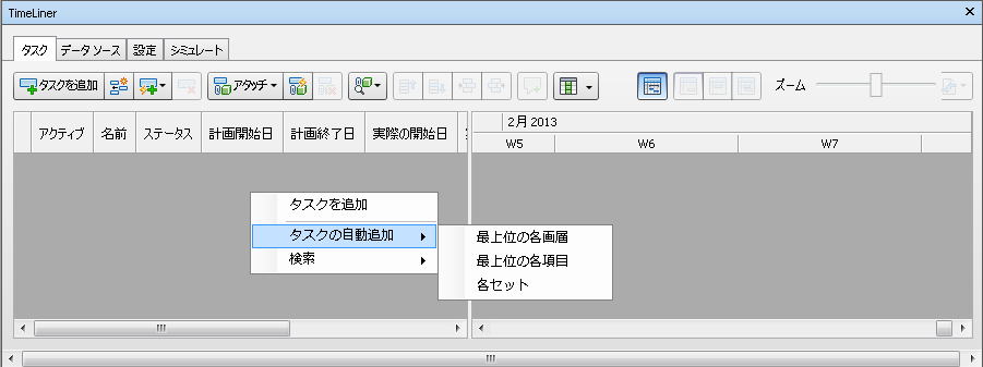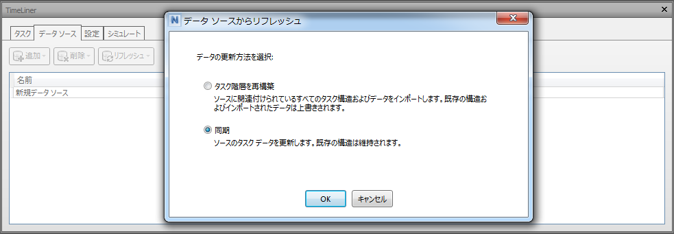 [データ ソース]タブを使用して、Microsoft Project™ などの外部ソースからタスクを読み込むことができます。外部スケジュールからフィールドを選択して、読み込まれるタスク タイプを定義するか、タスク タイプを手動で設定することができます。タスク パラメータを直接 TimeLiner で編集できます。もちろん、外部でスケジュールを更新して、TimeLinerでタスクを同期して外部ソースからのタスクとあわせることはできます。ただし、外部のプロジェクト ファイルからインポートされたタスクに対する変更内容は、対応するデータ ソースをリフレッシュしたときに上書きされます。
