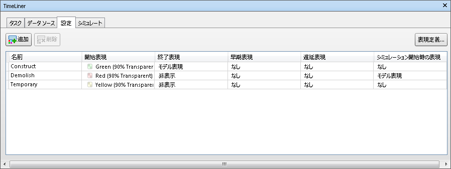 - シミュレーションの再生方法を調整します。[設定]タブを使用して、新しいタスク タイプを作成したり、古いタスク タイプを編集します。タスク タイプでは、その種類の各タスクが開始時と終了時にどのように動作するかを定義します。アタッチされているオブジェクトを非表示にしたり、表現を変更したり、モデルで指定されている表現にリセットすることができます。