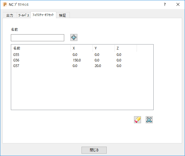 フィクスチャーオフセットに使用する名称は、NC プログラムを書出すオプションファイルに認識される必要があります。たとえば、Fanuc マシンコントローラーのオプションファイルは、G55、G56、G57 のような G コードを認識します。