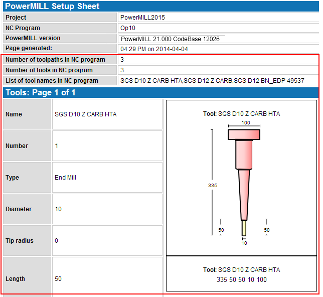 セットアップ シートをエクスポートすると、[要約] ページには、ツールパスおよび工具の数、工具名のリスト、および各工具の図が表示されます。