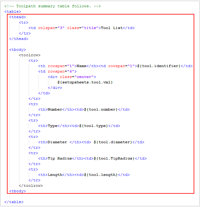 - [要約] ページにツールパスおよび工具の数、および工具名のリストを表示するには、Page Generated エレメントの下に次のエレメントを入力します。