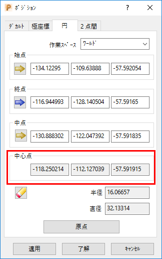 これにより、ポジション ダイアログの 中心点 セクションに座標が表示されます。