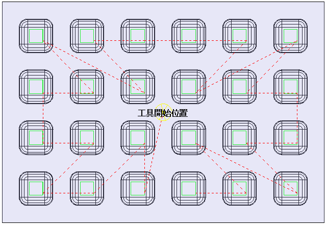 以下の例では、Y で片道 - X 方向沿いの例 に基づき、径方向パターンを持つツールパスを作成します。この場合、工具の始点から工具の径方向移動を計算し、径方向パス沿いにポケットを順に加工します。