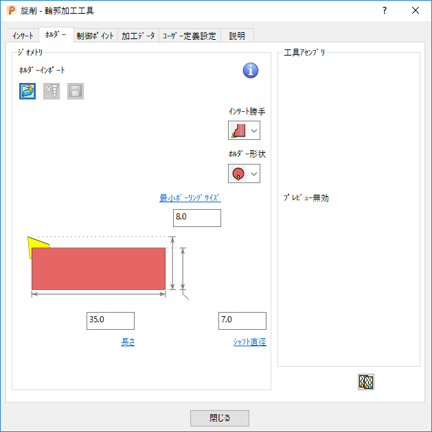 工具 ダイアログ ホルダー タブを使用し、工具のホルダー部を定義します。ツールパスは、工具ホルダー との接触を回避します。