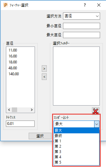 コンポーネント を使用し、特定孔コンポーネントの直径、または、長さで孔を選択します。これにより、孔コンポーネントのみの選択ではなく、孔全体が選択されます。