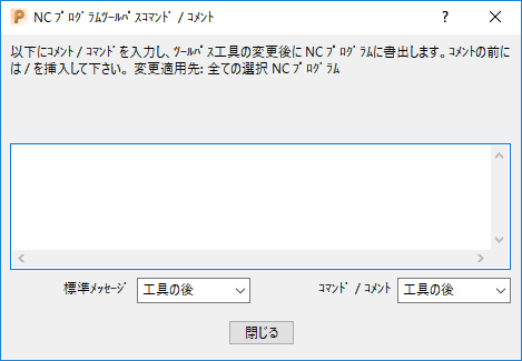 コマンド / コメント - 上のセクションに追加したコマンド / コメントの出力先を定義します。工具の前、および、工具の後の 2 つのオプションから選択します。ここにコマンドを入力する場合、コマンドの使用を前提としたオプションファイルの設定が必要になります。