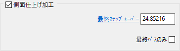 この例では、ダイアログ内の値の計算方法を説明します。ここでは、モデル領域切削 ストラテジーダイアログ 側面仕上げ加工 ページに値を入力します。