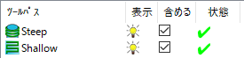 ツールパス一覧 - 当該工具を使用する全ツールパスおよび当該工具による加工内の干渉の有無を表示します。リストには、以下の 4 項目が表示されます。