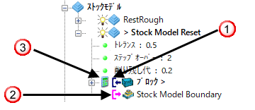 エンティティがストック モデルに適用されると、ストック モデル状態 を生成します。これは加工工程における特定のポイントにおけるストック マテリアルの状態を表し、ストック モデルで現在適用されているエンティティの操作によって定義されます。