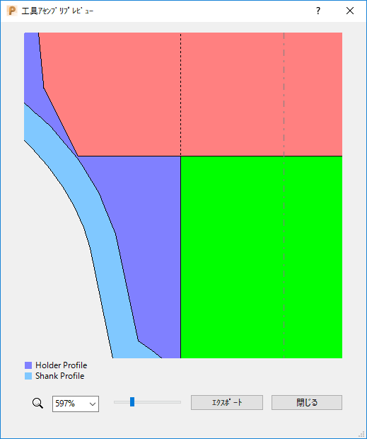 エクスポート - グラフィックファイルとして、工具アセンブリの現行ビューを保存します。1:1 のスケールで工具アセンブリのイメージを印刷することで、干渉を回避するために工具ホルダーを研磨する際に、ガイドとして使用することができます。
