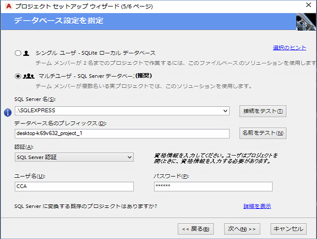 注: [プロジェクト セットアップ ウィザード]には、マルチユーザ パフォーマンスおよび信頼性が改善されたことを受けて、サーバベースのデータベースを使用するかどうかを指定するページがあります。このオプションを選択する場合は、まず、Microsoft SQL Server Express または Microsoft SQL Server をインストールする必要があります。