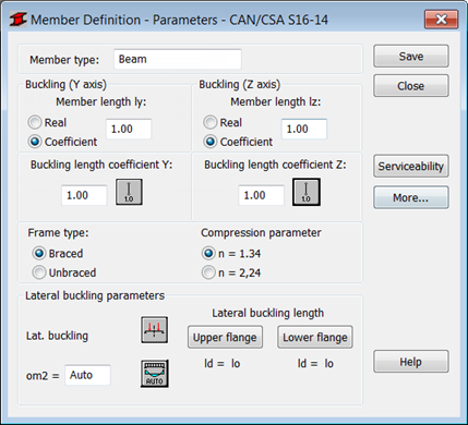 The Buckling Length Coefficient option defines member buckling length coefficients in both directions. The actual bar length (or the sum of the component member lengths) is automatically entered in the appropriate fields.