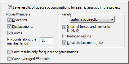 Save results of quadratic combinations for seismic analysis in the project is turned off by default. When off, the remaining parameters of the Seismic Analysis dialog cannot be set (except the Save averaged FE results option).