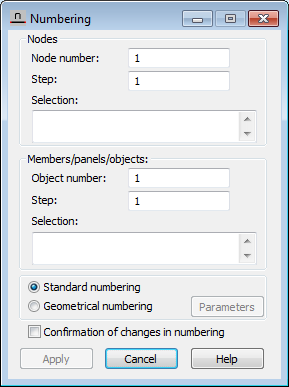 Selection - List of objects (members, panels, arcs, and so on) whose numbers will be changed. New object numbering is defined by two parameters: the number of the first object and the numbering step. |