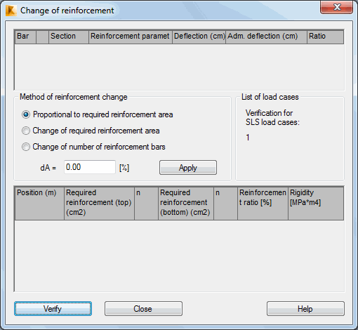 Click Reinforcement change on the RC Member Calculations: Report dialog to open the Change of reinforcement dialog. This enables semi-automatic correction of the calculated reinforcement in elements for which admissible deflection has been exceeded.