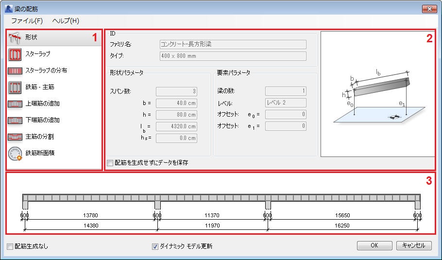 梁の配筋を生成するダイアログは、次の 3 つの主要部分に分かれています。