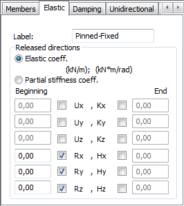 To define an elastic release, assign a label, select the degrees of freedom to be released at the beginning and the end of the member element. Also, you specify the following parameters: