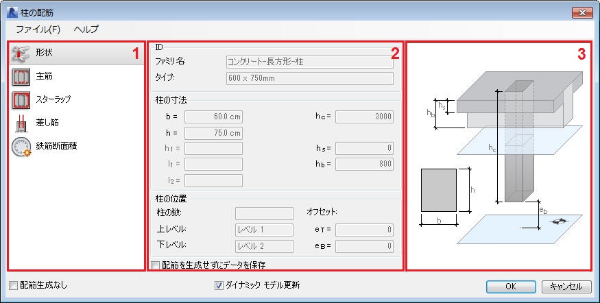 柱の配筋を生成するダイアログは、次の 3 つの主要部分に分かれています。