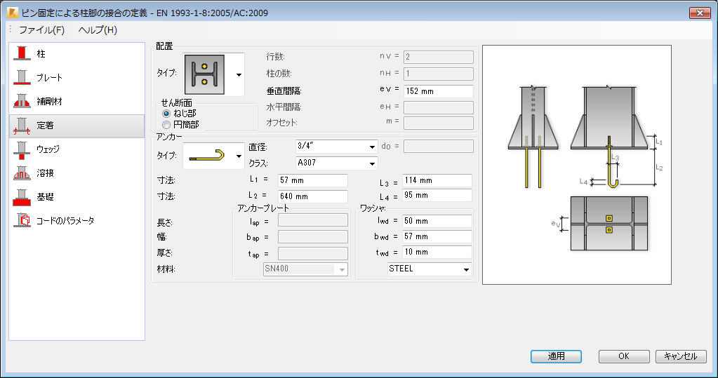 [アンカー] フィールドのオプションを使用して、定着パラメータを指定します。[タイプ]オプションでは、4 種類の定着タイプから 1 つを選択し、定着の直径と材料を定義します。[L1]、[L2]、[L3] および [L4] フィールドでは、定着の各面の長さを指定します。[アンカープレート]、[ワッシャ] フィールドでは、アンカープレートおよび定着用ワッシャのパラメータを定義します。
