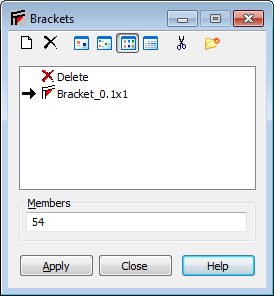 The Brackets dialog lets you directly assign bracket properties to structure elements. It has an active list field, active selection field, and the standard buttons (Apply, Close, and Help). Information about the label and the type of the defined bracket is in the active list field.