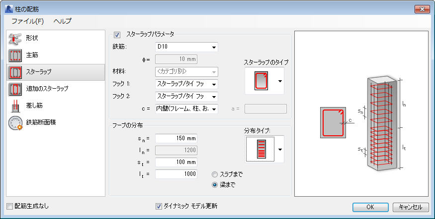 [柱の配筋] ダイアログでは、フープのパラメータをいくつか定義します。