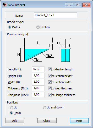 Note: A bracket defined through relative values is automatically adjusted to the member and the section. Therefore changing the section during design, changes the bracket dimensions that depend on the section dimensions.