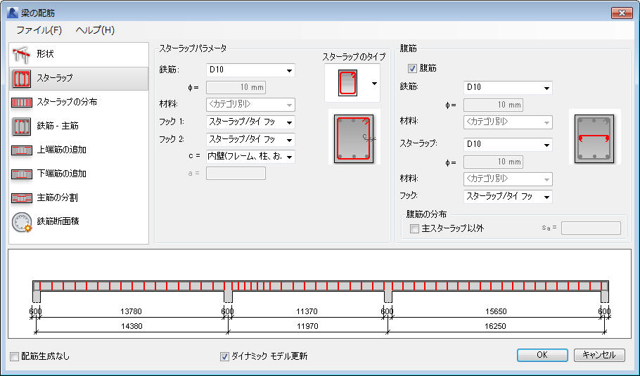 [梁の配筋] ダイアログでは、横筋 (スターラップ) のパラメータをいくつか定義します。