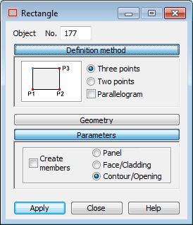 - Contour / Opening - When selected, the rectangle is only a contour with neither panel nor cladding properties assigned. If this contour is within a panel or another contour, an opening is created in it. However, if this contour is assigned: