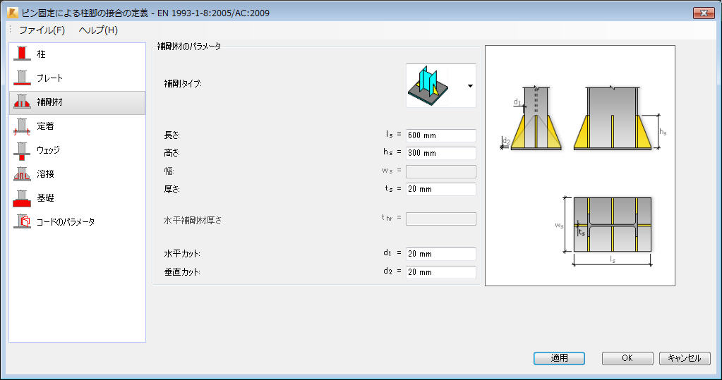 [補剛タイプ]の選択リストから適切なアイコンをクリックして、ベース プレートを補強する方法を指定します。