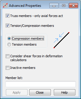 This option is used to specify additional properties for structure members such as: truss members (for which axial forces act), members which can perform only in tension or compression, as well as members for which the influence of shear forces on structure deformations is considered. Open the Advanced Properties dialog using either method:
